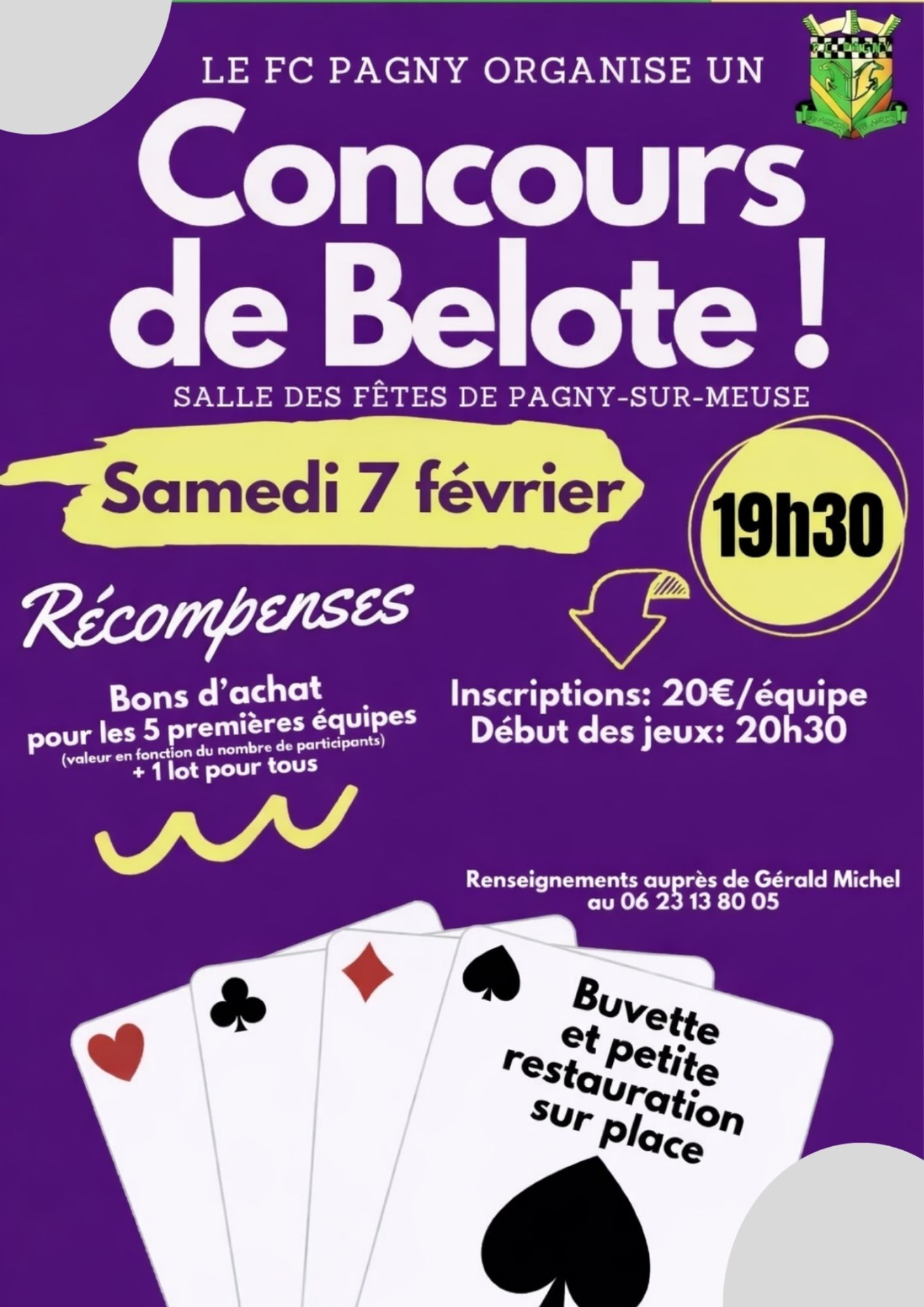 Le samedi 07 février à 19h30, concours de belote à la salle des fêtes de Pagny sur Meuse. De nombreux lots à gagner comme des bons d'achat.